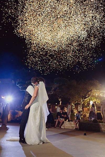In this dreamy villa, in Fiore Levante(εδώ εννοούμε την βιλα, Γιατι Φιορο του Λεβαντε ειναι θεατρικο εργο?), surrounded by nature, with the blue swimming pool and the sea as background, the couple and their guests danced to Zakynthien rhythms, as well as to rhythms of everlasting love until morning.